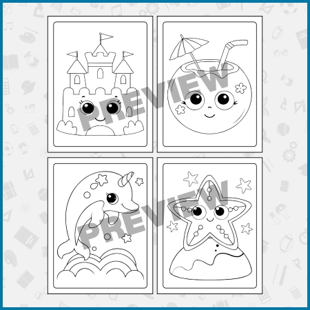 Bright, sunny beach scenes perfect for kids to color and enjoy a taste of summer anytime.