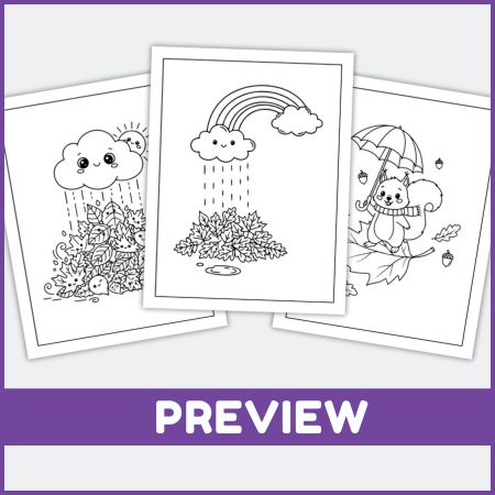 Choose any page showing your favorite fall weather scene. Look carefully at all the details—clouds, leaves, scarves, and boots. Use bright colors for clothes and umbrellas, and soft shades for rain and clouds. Take your time and enjoy coloring. When you finish, share your masterpiece with your family or display it proudly!