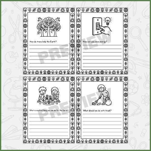 Children will observe Earth Day-themed pictures, think about the prompt, and write short sentences or answers on the lines provided. Each page focuses on one writing activity.