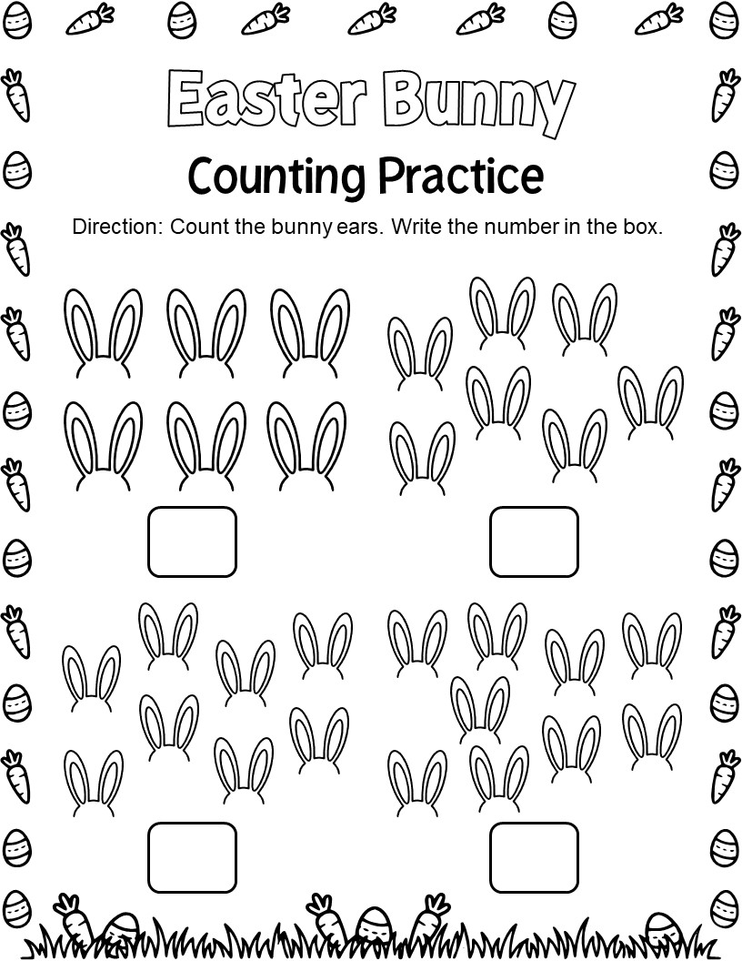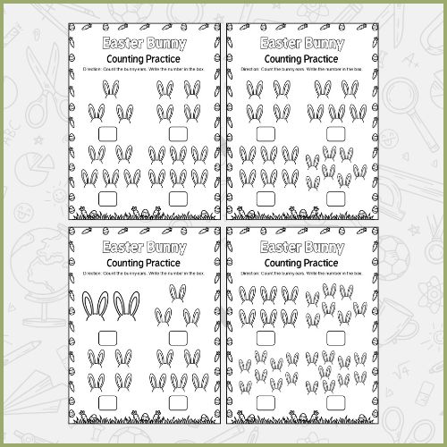 Look at each group of bunny ears and count them carefully. Think about the total number in each group and write the correct number in the box provided. After completing a page, review the answers and continue to the next one. The numbers may gradually increase, allowing practice with a wider range of counting.