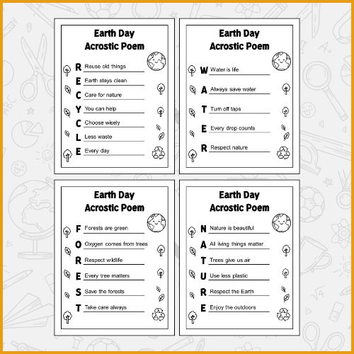The Earth Day Acrostic Poem Worksheet is a fun and meaningful writing activity designed to help children explore creativity while learning about caring for the environment. This worksheet encourages young learners to think about important Earth Day themes such as nature, recycling, conservation, and protecting the planet. By using simple words like EARTH, GREEN, or WATER, children can create their own poems in an engaging and structured format that builds both writing confidence and environmental awareness. This activity blends creativity with education by allowing kids to express their thoughts through short phrases connected to each letter of a chosen word. It supports early literacy skills, vocabulary development, and critical thinking as children reflect on positive actions that help the Earth. The acrostic format makes writing easier and more enjoyable, especially for younger students who are just beginning to explore poetry and sentence formation. This worksheet is suitable for classrooms, homeschooling, or independent practice and works well for Earth Day lessons, writing centers, or seasonal activities. It promotes thoughtful discussions about environmental responsibility and encourages children to share their ideas with others, helping build communication skills and confidence.