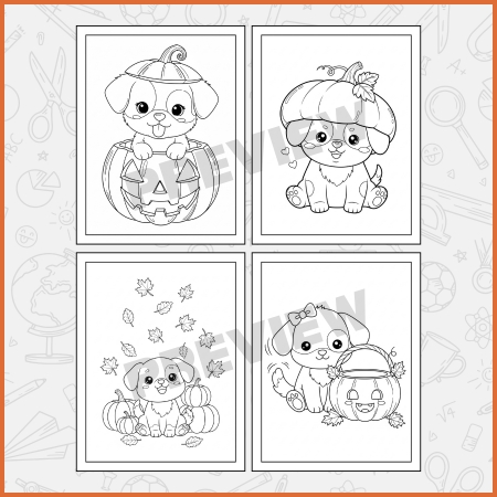 Coloring adorable Halloween puppies dressed in spooky costumes like ghosts, witches, and pumpkins.