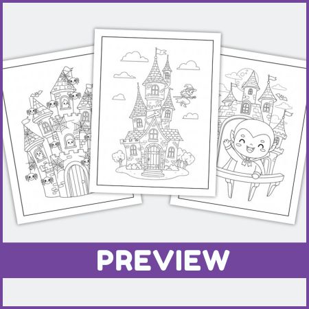 Color the haunted castle designs using your favorite colors. Add your own spooky details like bats, ghosts, or stars to make each castle unique!