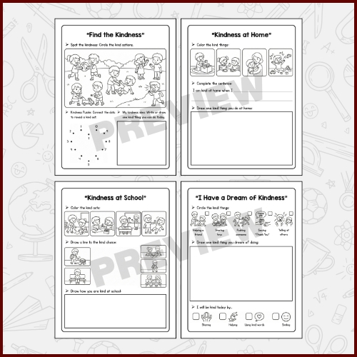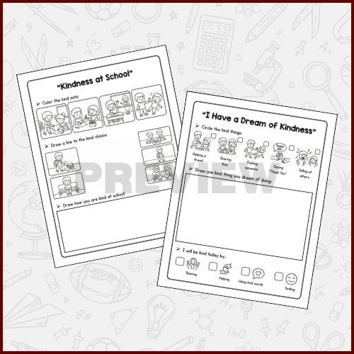 I Have a Dream of Kindness Black History Month Activity – SEL Kindness Worksheet is a thoughtful and age-appropriate resource designed to help students reflect on kindness, empathy, and positive behavior during Black History Month. This meaningful SEL pack encourages children to express kind dreams, caring actions, and respectful choices through engaging activities. I Have a Dream of Kindness Black History Month Activity – SEL Kindness Worksheet is ideal for Elementary School, Kindergarten (K), 1st Grade, 2nd Grade, 3rd Grade, 4th Grade, and 5th Grade learners. Students practice social emotional skills while drawing, coloring, tracing, and completing simple writing prompts focused on kindness at school, home, and with friends. This resource is suitable for classrooms in the United States, Canada, United Kingdom, Australia, and other English-speaking countries. I Have a Dream of Kindness Black History Month Activity – SEL Kindness Worksheet supports discussions about kindness, respect, inclusion, and positive community behavior in a developmentally appropriate way.Each page encourages creativity and reflection while reinforcing SEL concepts such as empathy, sharing, helping others, and using kind words. Teachers can use I Have a Dream of Kindness Black History Month Activity – SEL Kindness Worksheet during February lessons, morning meetings, writing centers, or as a calm reflection activity. This printable resource is easy to use and requires minimal preparation.