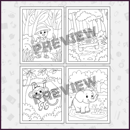 Kids color jungle scenes featuring safari animals. They can add extra drawings, create stories, and display their completed pages at home or in class.
