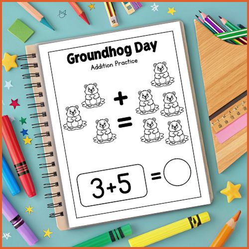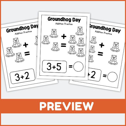 Children solve fun Groundhog Day-themed addition problems, write answers in the spaces provided, and practice counting and number recognition in an engaging way.