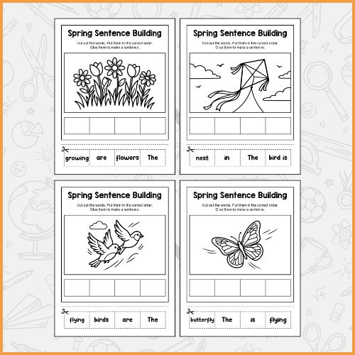 Cut and paste word cards and arrange them to form sentences that match the spring-themed images.