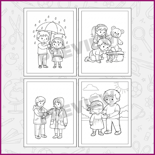 Helping Friend Coloring Pages for Kids is a thoughtful and engaging collection designed to introduce young learners to the values of kindness, empathy, and friendship through creative coloring activities. Each page presents simple and heartwarming illustrations that reflect helping behaviors, friendly interactions, and positive social moments. These visuals encourage children to understand the importance of caring for others while enjoying a relaxing and imaginative coloring experience. This worksheet set blends creativity with early social-emotional learning, allowing children to explore meaningful concepts in a fun and approachable way. As they color, kids naturally begin to reflect on actions such as sharing, supporting friends, and showing kindness in everyday situations. The activity supports emotional growth while also strengthening focus, patience, and fine motor development. It becomes a gentle tool for building both artistic expression and positive character traits. The open-ended nature of each page allows children to interpret scenes freely, using colors and creative choices to express their own understanding of friendship and helpfulness. This encourages confidence in decision-making and nurtures imagination without pressure or strict guidelines. It is suitable for both classroom environments and at-home learning, making it a versatile resource for teachers and parents who want to introduce kindness-based themes.