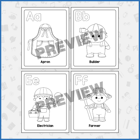 Color alphabet letters and job-related images, say letter names and sounds, discuss job roles, and enjoy add-on activities like role-play or scavenger hunts.