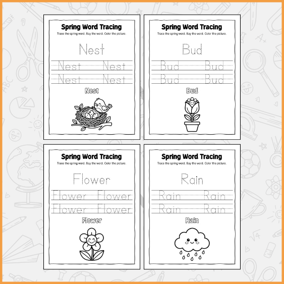 This spring-themed worksheet is designed to help young learners explore early reading and handwriting skills in a fun and engaging way. Preschool and kindergarten children can practice tracing simple spring words like flower, rain, sun, bee, nest, and tree, which helps them develop fine motor skills and letter recognition. The worksheet combines visual learning with hands-on practice, allowing children to see a word, trace it carefully, and then reinforce their understanding by reading it aloud. Each word is paired with a matching picture, giving students the opportunity to color while connecting the word with its meaning. This approach encourages creativity and makes learning more memorable. Parents and teachers can use these pages to support literacy at home or in the classroom. The structured yet playful format guides young learners through tracing letters, writing words independently on practice lines, and recognizing word patterns, helping build confidence in reading and writing. By combining tracing, reading, and coloring, this worksheet creates a multi-sensory learning experience, perfect for early learners preparing for kindergarten or first grade. It is ideal for children who enjoy interactive and visual learning, offering a balance between fun and education. The worksheets provide a safe and supportive environment for children to practice at their own pace while reinforcing spring-themed vocabulary in a playful, engaging manner.
