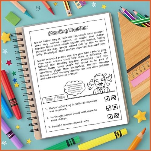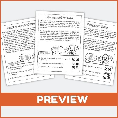 Introduce children to the inspiring life and message of Martin Luther King Jr with Martin Luther King Jr Reading Comprehension Worksheets – Black History Month True or False Activities for Kids. These worksheets are perfect for Elementary School, Kindergarten (K), 1st Grade, 2nd Grade, 3rd Grade, 4th Grade, and 5th Grade students. Each page contains a short passage about Martin Luther King Jr and is followed by True or False questions, making learning engaging and interactive. These Martin Luther King Jr Reading Comprehension Worksheets – Black History Month True or False Activities for Kids are designed to help students improve reading comprehension, critical thinking, and knowledge about civil rights history. The activities are ideal for classrooms in the United States, Canada, the United Kingdom, Australia, and other English-speaking countries. Children in Kindergarten, 1st Grade, 2nd Grade, 3rd Grade, 4th Grade, and 5th Grade can easily follow the instructions and mark their answers with colors, circles, or checkmarks. Teachers and parents will love using Martin Luther King Jr Reading Comprehension Worksheets – Black History Month True or False Activities for Kids for engaging lessons during Black History Month or as part of a social studies curriculum. These worksheets encourage young learners in Elementary School, Kindergarten, 1st Grade, 2nd Grade, 3rd Grade, 4th Grade, and 5th Grade to develop reading skills while learning about Martin Luther King Jr’s life, actions, and message of equality and kindness.