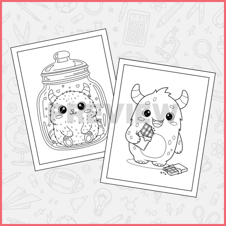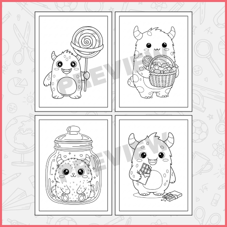 Kids color different cute monsters and candy-themed scenes to enhance creativity and imagination.