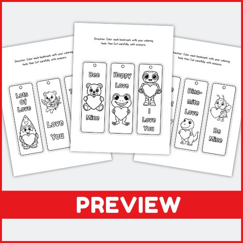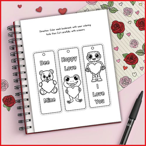 Kids can color, personalize, and cut out the Valentine-themed bookmarks to use in their favorite books or gift to friends and family, blending creativity with practical use.
