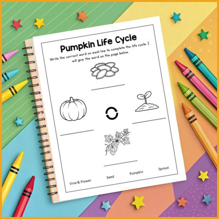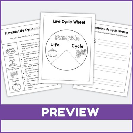 Open the worksheet and start with the introduction to the pumpkin life cycle. Use the word bank to label diagrams and answer questions. Follow the cut-and-paste activities to arrange the stages in order. Color and trace words for practice. Complete the life cycle wheel to review all four stages.