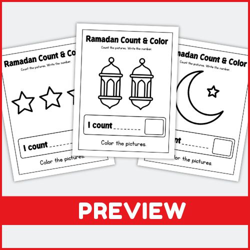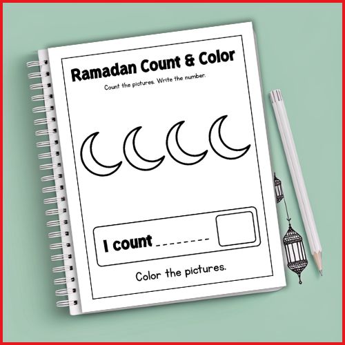 Look at each worksheet page carefully and observe the Ramadan-themed pictures. Count each image slowly to find the total number shown. Write the correct number on the provided line labeled “I count.” After counting, color the pictures creatively using preferred coloring tools while trying to stay inside the lines for neatness.