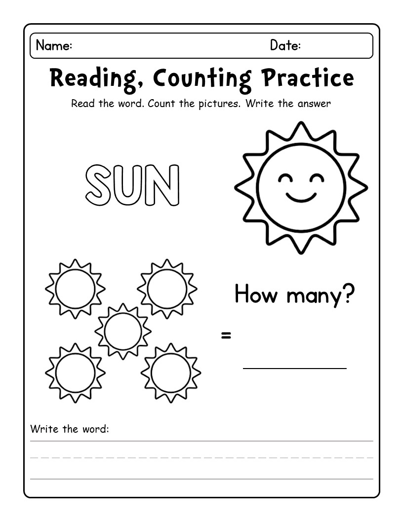 Read and Count Worksheets for Kids – Early Learning Literacy and Number Practice