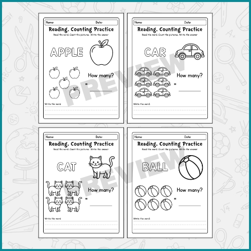 Reading and Counting Practice Worksheets for Kids provide a simple and engaging way for young learners to build essential early literacy and math skills. This resource combines word recognition with counting practice, allowing children to connect reading with numbers in a meaningful and interactive way. Each page presents a word along with related images, encouraging children to observe, think, and apply their understanding while completing the activity. These worksheets support foundational learning by helping children recognize words, improve counting accuracy, and strengthen number awareness. As children engage with the pages, they develop concentration and attention to detail while also practicing important skills such as one-to-one correspondence. The combination of reading and counting creates a balanced activity that supports both language development and basic math concepts. Designed for preschool and kindergarten learners, the worksheets offer a structured yet flexible learning experience. The simple layout makes it easy for children to focus on the task, while the repetition across pages builds confidence and independence. This resource is well-suited for classroom centers, homeschooling environments, or extra practice at home. The activities promote active participation and encourage children to think carefully as they count and identify the correct answers. By engaging with both words and images, children enhance their ability to make connections between visual information and written language. Over time, this practice can help improve early reading fluency and counting skills.