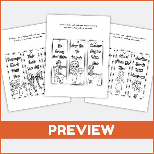 Color each bookmark using your favorite coloring tools. Cut along the outlined edges carefully. Ask an adult for help if needed. Use your finished bookmarks while reading or share them with others to celebrate Rosa Parks and Black History Month.