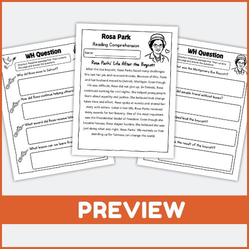 Ideal for classroom activities, homework, literacy centers, distance learning, or social studies lessons. Students practice reading comprehension, WH questions, and critical thinking skills while learning about Rosa Parks and the Civil Rights Movement.