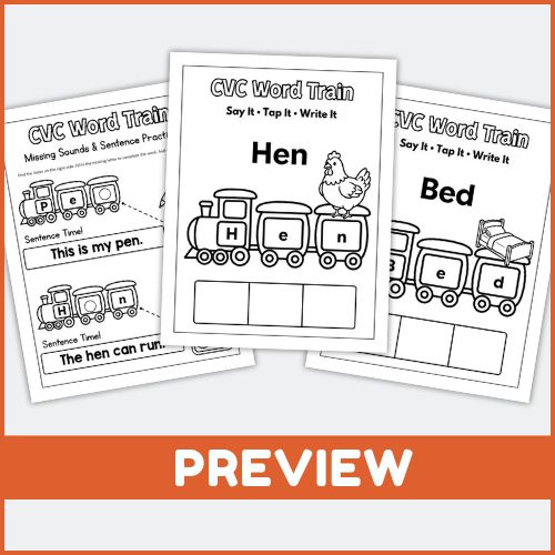 Short E CVC Words Worksheets – CVC Words Train Phonics Practice