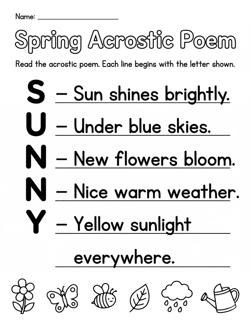 Spring Acrostic Poems Worksheets – Spring Poetry Writing and Reading Activity is a fun and engaging literacy resource designed to help young learners explore poetry while strengthening reading and vocabulary skills. These worksheets introduce students to acrostic poetry, a simple and creative form of poetry where each line begins with the letters of a vertical word. The theme focuses on spring, allowing children to connect language learning with seasonal topics such as flowers, sunshine, gardens, and nature. This educational resource encourages students to observe how words and sentences are formed using the letters of a specific word. By reading the poems from top to bottom, learners can understand how each letter begins a new line while still creating a meaningful poem about spring. The activity supports early literacy development by helping children recognize sentence structure, letter sounds, and new vocabulary related to the season. The worksheets are especially helpful for elementary students who are developing reading confidence and beginning to explore creative writing. Through simple poems and clear layouts, children become familiar with how poetry works while also practicing reading fluency. Exposure to seasonal vocabulary such as garden, sunny, flowers, and trees helps expand language knowledge and encourages curiosity about nature. In addition to reading practice, the worksheets provide opportunities for students to observe patterns in words and sentences. This makes the resource useful for both classroom learning and home practice. Teachers and parents can use these worksheets to support literacy lessons, creative thinking, and vocabulary building during spring-themed activities. By connecting poetry with seasonal topics, learners can develop an appreciation for language while enjoying a creative and meaningful educational experience.