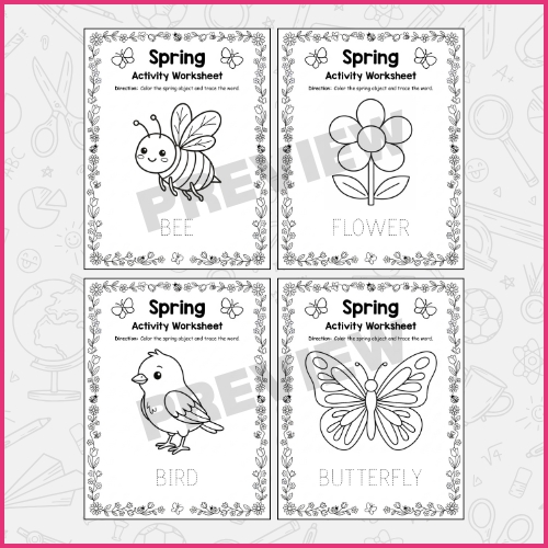 Perfect for preschool, kindergarten, and early elementary children to practice tracing, coloring, and learning spring-related vocabulary in an engaging and interactive way.