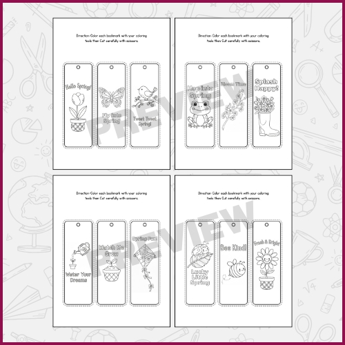 Spring Bookmarks Printable for Kids is a creative seasonal worksheet designed to combine coloring fun with simple craft learning. This printable activity introduces children to spring-themed visuals while helping them develop creativity, focus, and fine motor coordination. The bookmark format makes the activity meaningful because children create something they can actually use while reading books, school materials, or story time favorites. The worksheet usually includes cheerful spring elements such as flowers, sunshine, nature patterns, and friendly characters that encourage artistic exploration. Coloring activities are often associated with relaxation and imagination, making them a positive screen-free option for classrooms, homeschooling, or leisure learning at home. Craft-based worksheets like bookmarks also support early responsibility habits, as children value and keep items they create themselves.This printable can complement seasonal lessons, reading programs, library activities, or holiday craft sessions. Teachers and parents often find bookmark coloring helpful for encouraging reading interest, since a personalized bookmark makes reading more engaging. It also promotes patience and careful hand movement through cutting and coloring tasks.