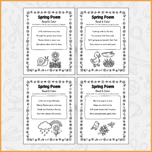 Spring Poem for Kids Read and Color Worksheets is a fun and engaging literacy activity designed to help young learners explore poetry while enjoying creative coloring time. This printable resource combines simple spring-themed poems with matching illustrations that children can color after reading. The activity encourages early reading development while allowing children to connect words with visual elements related to the spring season. Each worksheet features a short and easy poem written using simple vocabulary suitable for preschool, kindergarten, and early grade learners. The poems introduce common spring themes such as flowers blooming, birds singing, bees buzzing, butterflies flying, and rainy spring days. As children read the poem, they begin to recognize important seasonal words and build confidence in reading short sentences and rhyming patterns. The coloring portion adds a creative and relaxing element to the learning process. Children can express their imagination by choosing bright spring colors while focusing on the pictures mentioned in the poem. This helps strengthen reading comprehension as learners visually identify objects described in the text. This type of activity also supports multiple early learning skills including vocabulary development, word recognition, visual comprehension, and fine motor coordination. The combination of reading and coloring keeps students engaged while reinforcing literacy skills in a playful and accessible format. Teachers, homeschool parents, and caregivers often use these worksheets during spring literacy centers, seasonal classroom activities, morning work, or quiet learning time. The simple format allows children to practice reading independently or together with guidance from adults. The worksheets provide a gentle introduction to poetry and encourage children to appreciate rhythm, language, and nature themes while enjoying a hands-on creative activity.