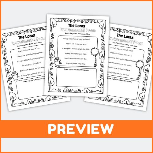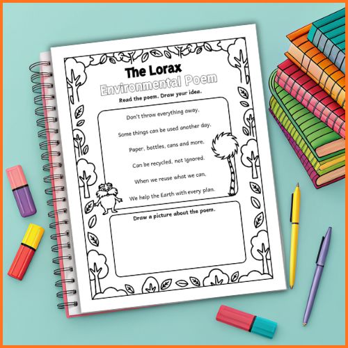 This Lorax-themed environmental worksheet is designed to engage young learners with the magic of nature while fostering creativity and literacy skills. Each page presents a short, delightful poem inspired by Dr. Seuss’ The Lorax, encouraging children to reflect on trees, animals, clean water, recycling, and other ways to protect the environment. Children will enjoy reading each poem carefully, letting the imagery spark ideas and imagination. After exploring the words, kids are invited to create their own illustrations, bringing the poem to life with personal interpretation and artistic expression. This combination of reading and drawing helps reinforce comprehension, critical thinking, and environmental awareness in a fun and interactive way. Perfect for early elementary students, the worksheets are suitable for Kindergarten through 2nd Grade (ages 5–8) and offer a creative platform for children to connect with nature while learning important lessons about caring for the Earth. me, in the classroom, or during special Earth Day events. They provide a screen-free activity that combines literacy, creativity, and environmental education. The large drawing space allows for open-ended expression, helping children to build confidence in storytelling and art. This resource also encourages mindfulness and reflection as kids imagine the natural world and consider ways to contribute to its protection. With engaging poems and creative drawing prompts, this worksheet set inspires curiosity, learning, and a love for nature.
