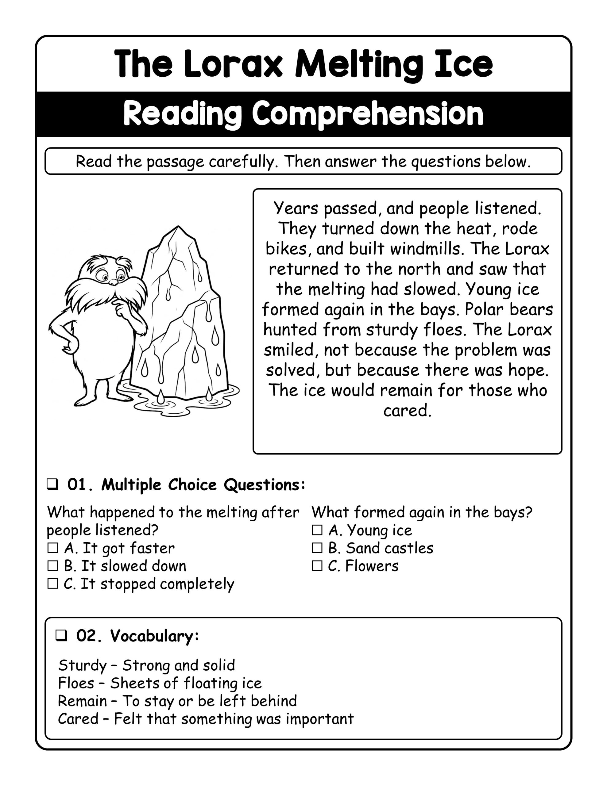 The Lorax Melting Ice Reading Comprehension Worksheet for Kids