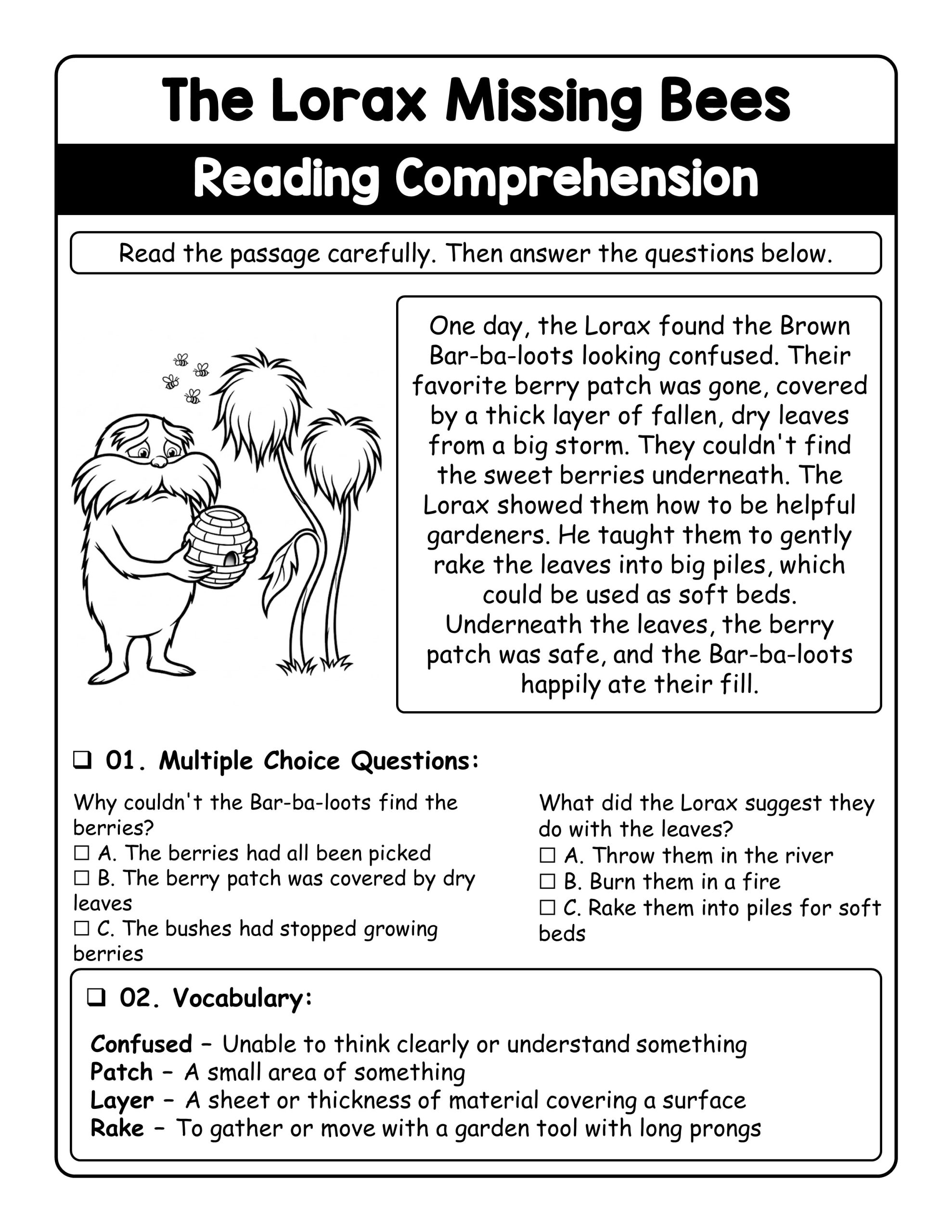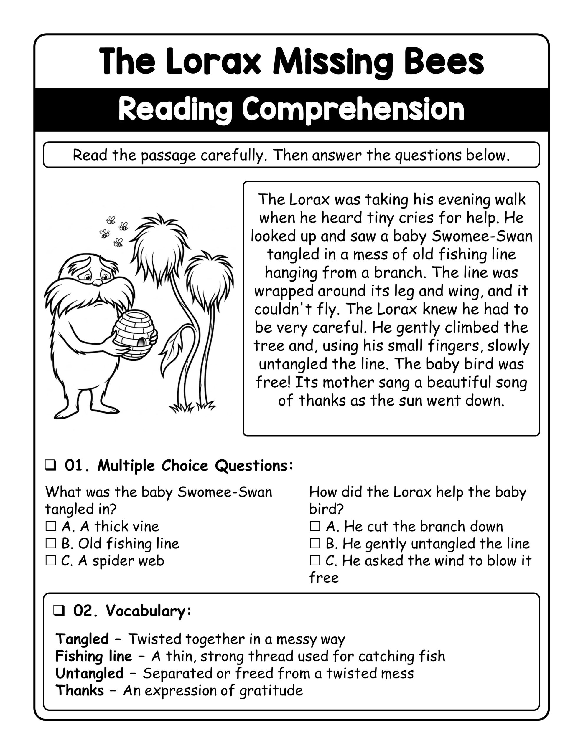 Introduce children to the enchanting world of Dr. Seuss’s The Lorax with a fun and educational missing bees reading comprehension worksheet. This activity encourages young learners to engage with a meaningful story while building key literacy and environmental awareness skills. Children explore new vocabulary, practice reading fluency, and strengthen their comprehension by answering questions related to the story. Each page includes charming illustrations inspired by The Lorax, offering a creative way to connect with the narrative through coloring. The worksheet also promotes critical thinking by encouraging discussions about the story’s main ideas and its lessons about caring for the environment. This makes the activity a perfect blend of learning and creativity, helping kids develop fine motor skills, reading proficiency, and environmental consciousness while having fun.
