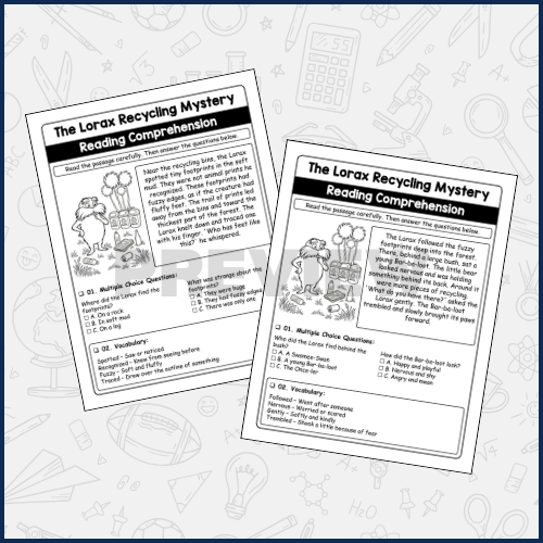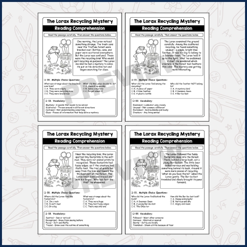 The Lorax Recycling Mystery Reading Comprehension for Earth Day is an engaging literacy activity inspired by the environmental message of The Lorax by Dr. Seuss. This worksheet combines reading practice, vocabulary development, comprehension skills, and creative coloring to create a meaningful Earth Day learning experience for young learners. Designed for elementary students, the passage introduces a recycling-themed mystery that encourages children to think about protecting the environment while strengthening essential literacy skills. The reading section helps students improve fluency and understanding through a short, age-appropriate story. A focused vocabulary section supports language growth by introducing important environmental and recycling-related words. Multiple choice comprehension questions reinforce key details, main ideas, and critical thinking skills. The coloring component adds a creative element, helping children connect visually with the environmental theme while developing fine motor skills. This worksheet supports classroom learning during Earth Day celebrations and environmental awareness units. It encourages thoughtful discussions about recycling, sustainability, and caring for the planet in a child-friendly way. By combining literacy with creativity, the activity makes learning both educational and enjoyable. It works well for independent practice, small group work, homework assignments, literacy centers, or seasonal Earth Day activities.