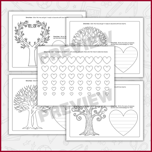Students color a tree, write a loving message inside a large heart, create heart-shaped “love leaves,” and decorate their tree by pasting the hearts onto the branches.